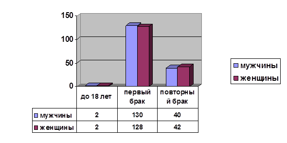 Люди разводятся не для того, чтобы всю жизнь жить в одиночестве. Они хотят заменить неудачный брак счастливым, но это не всегда удаётся. Статистические данные по г. Балей за 2008 год говорят о том, что 130 мужчин и 128 женщин состоят в первом браке. 40 мужчин и 42 женщины – состоят в повторном браке (см. гистограмму 3). При социологических опросах больше половины мужчин и женщин хотели бы вступить в повторный брак. Лишь незначительная часть предпочли одиночество.